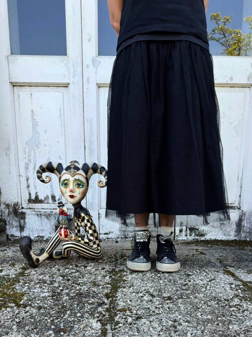 She is a frozen monochrome world, harboring the faded colors of past celebrations. Within the graphic rhythm of her garments sleeps the dust and memory of times when laughter shattered the silence. Like a frame from an old film, where life has paused in flawless stillness, a hidden color has already stirred within her — emerging through the monochrome as the first manifestation of returning life.